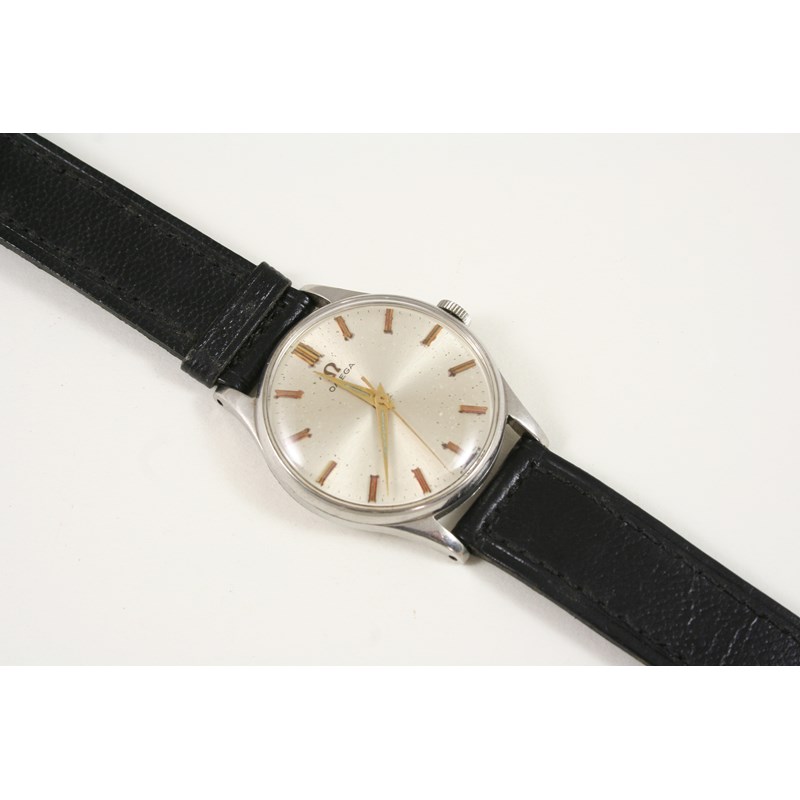 A GENTLEMAN'S STAINLESS STEEL WRISTWATCH BY OMEGA the signed circular dial with baton numerals and subsidiary seconds dial, 32mm. dia.
