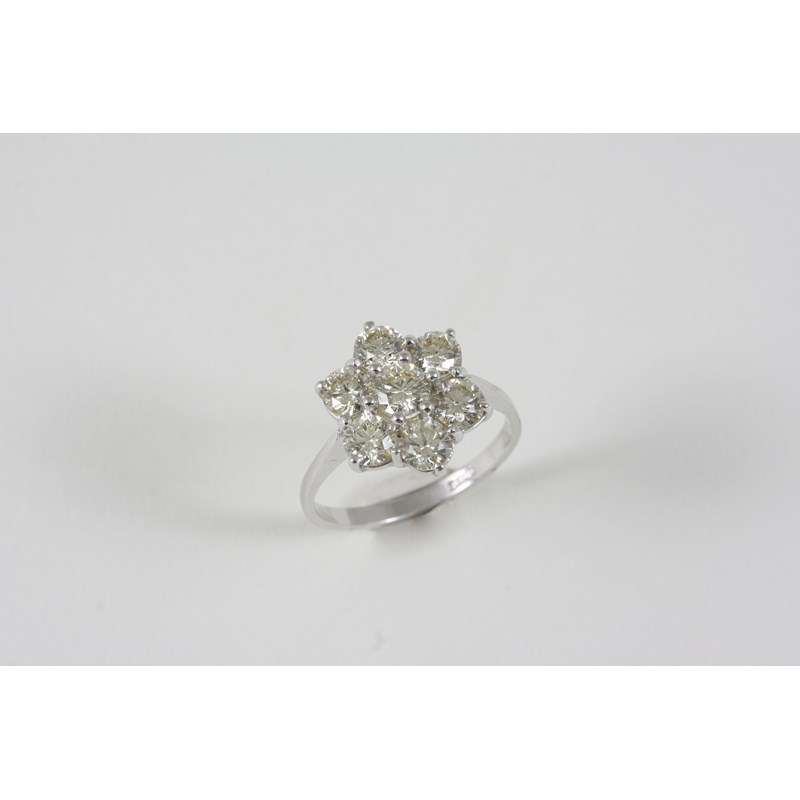 A DIAMOND CLUSTER RING of flowerhead form, set with circular-cut diamonds weighing approximately 2.30 carats in total, in 18ct. white gold. Size O.