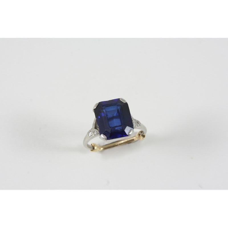 A SYNTHETIC SAPPHIRE AND DIAMOND RING the rectangular-shaped synthetic sapphire is set with three single-cut diamonds to each shoulder, in platinum. Size K.