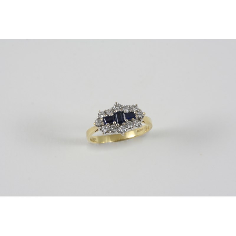 A SAPPHIRE AND DIAMOND CLUSTER RING centred with three rectangular-shaped sapphires within a surround of twelve circular-cut diamonds, in 18ct. gold. Size N.