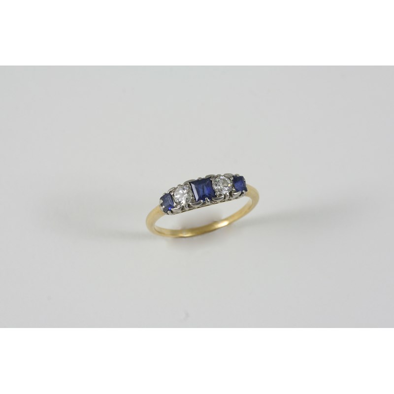 A SAPPHIRE AND DIAMOND FIVE STONE RING the three graduated square-shaped sapphires are set with two circular-cut diamonds, in gold. Size N 1/2.