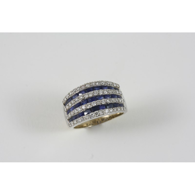 A SAPPHIRE AND DIAMOND HALF HOOP RING formed with alternate rows of circular-cut diamonds and rectangular faceted sapphires, in white gold. Size O.