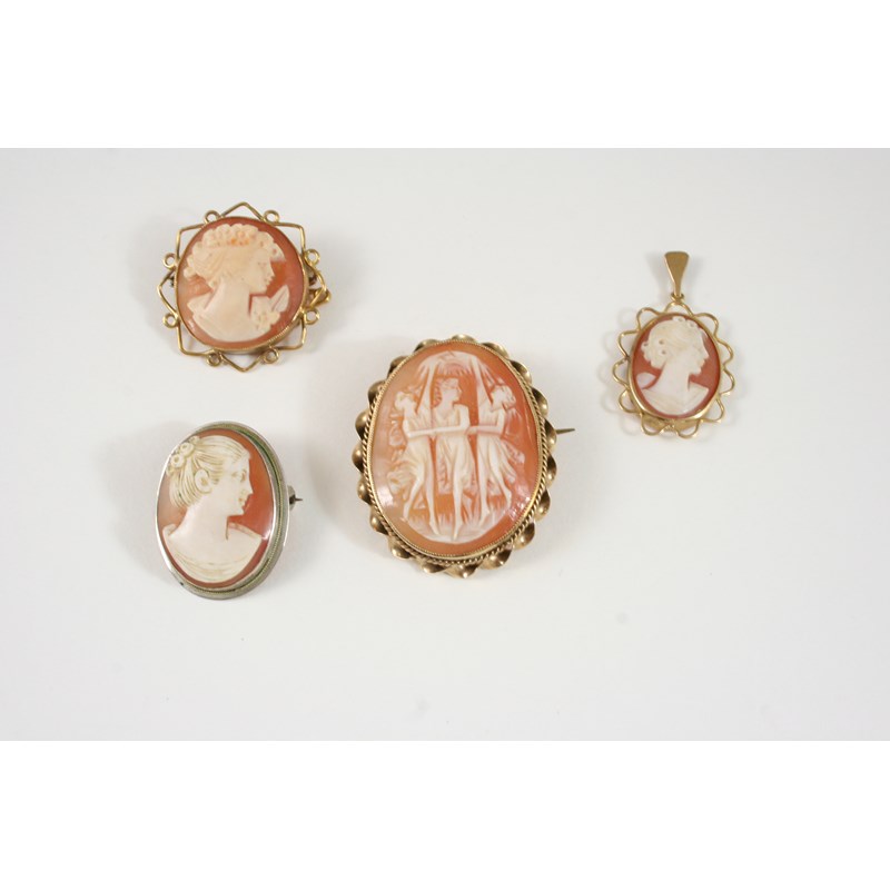 AN OVAL CARVED SHELL CAMEO BROOCH depicting The Three Graces, 3.5 x 3cm., together with two other shell cameo brooches and a pendant.