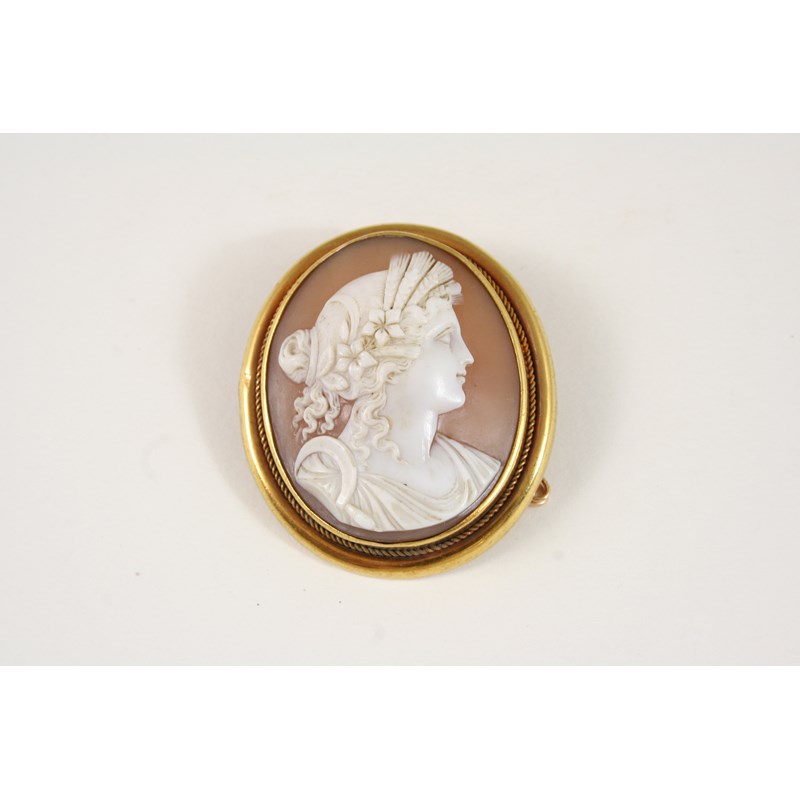 depicting the goddess Demeter in Greek dress, wearing flowers and ears of corn in her hair, in a 15ct. gold mount, 4.5 x 4cm.
