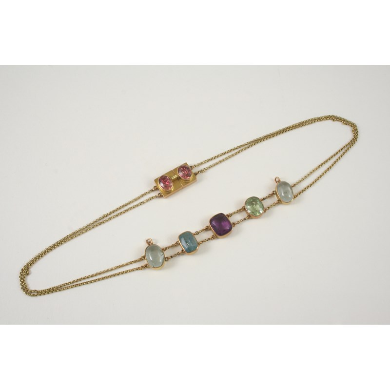 A GOLD AND GEM SET NECKLACE the gold double row chain necklace is mounted with assorted gemstones, including moonstone, amethyst and aquamarine, 38cm. long.