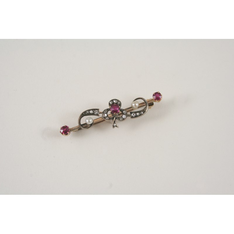 A VICTORIAN RUBY, DIAMOND AND PEARL SET BROOCH the foliate scrolling design is set with rose-cut diamonds, three circular rubies and two small pearls, in silver and gold, 4.5cm. long.