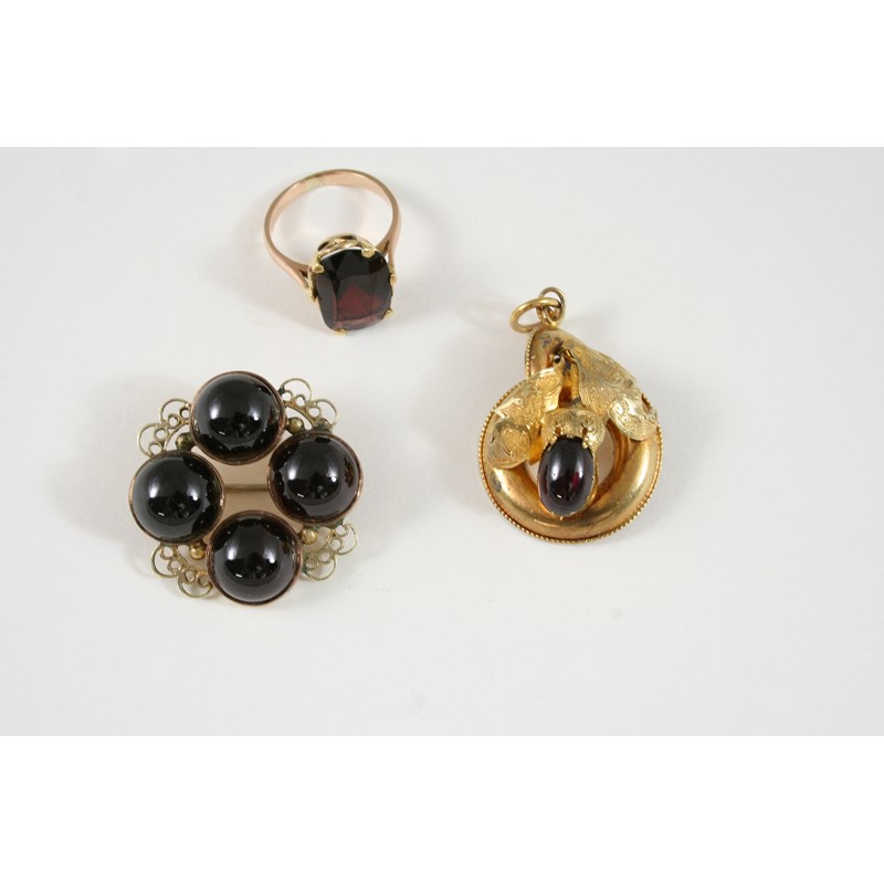 set with four circular cabochon garnets in gold closed back settings, 3cm. wide, together with a gold and garnet foliate pendant, 3.5cm. long and a garnet single stone ring, set in gold, size I 1/2.