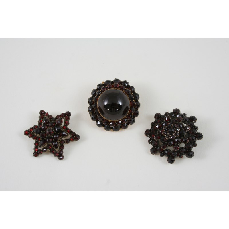 A VICTORIAN GARNET BROOCH centred with a circular cabochon garnet within a surround of circular faceted garnets, in gilt metal, 3cm. dia., together with two other garnet set brooches.