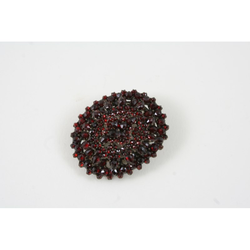A VICTORIAN GARNET BROOCH PENDANT mounted with pear-shaped and circular faceted garnets, in gilt metal, with locket compartment to the reverse, 4 X 3.5cm.