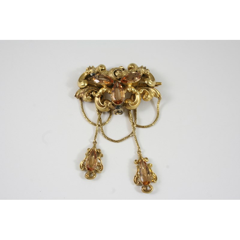 A VICTORIAN GOLD AND TOPAZ BROOCH the ornate scrolling and engraved gold design is set with three pear-shaped topazes and suspends two pear-shaped topaz and gold drops, 5.5cm. wide.