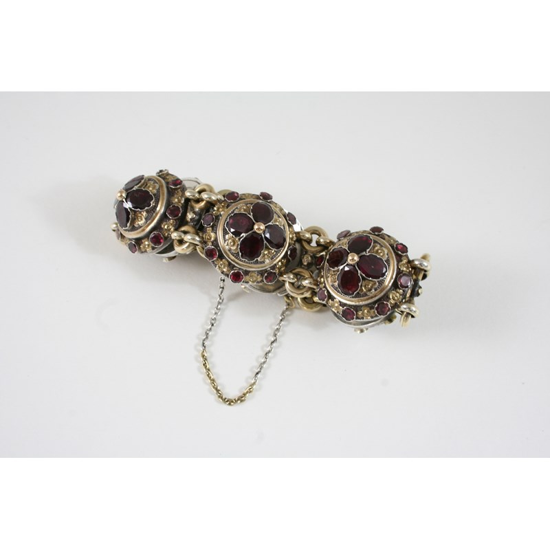 A GARNET AND SILVER GILT BRACELET formed with six circular domed sections, set with oval and circular garnets, 19cm. long.