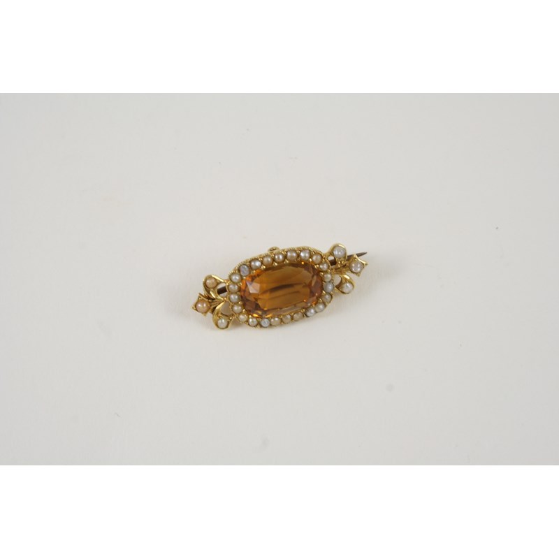 A CITRINE AND PEARL SET BROOCH the oval-shaped citrine is set within a surround of small pearls, in gold, 3cm. wide.