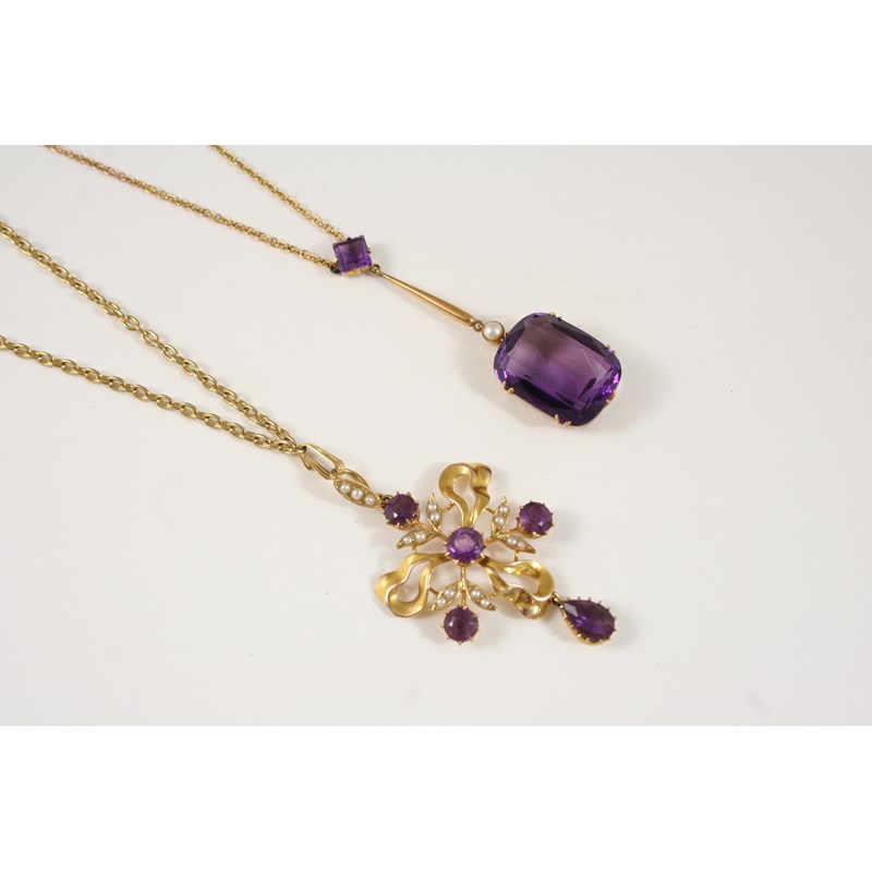 AN EARLY 20TH CENTURY AMETHYST AND PEARL SET PENDANT