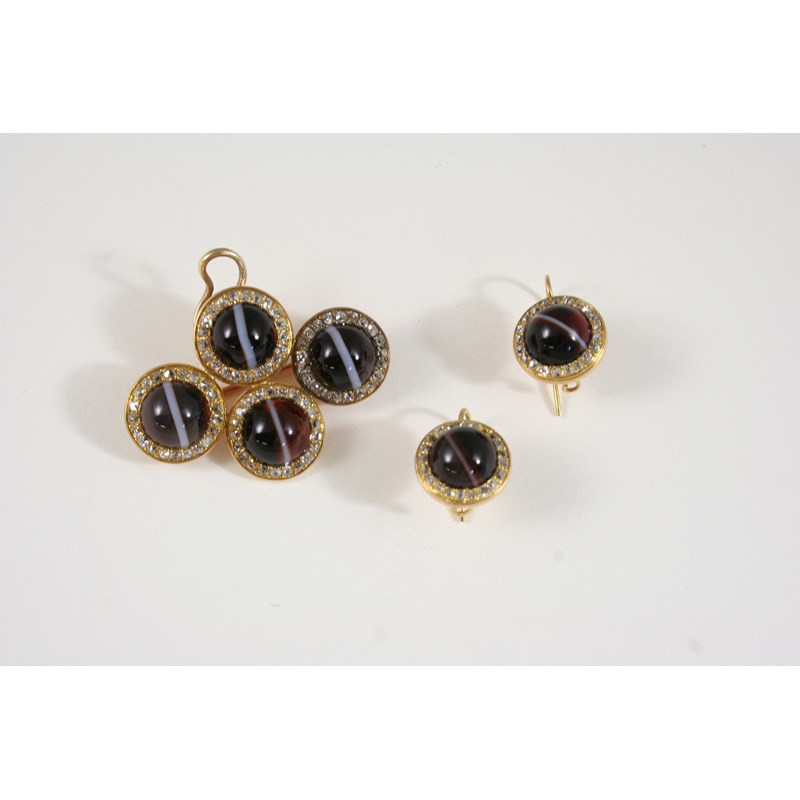 formed as four clusters of circular banded agate cabochons within surrounds of rose-cut diamonds, in gold, 4.5cm. wide, together with a pair of match earrings.