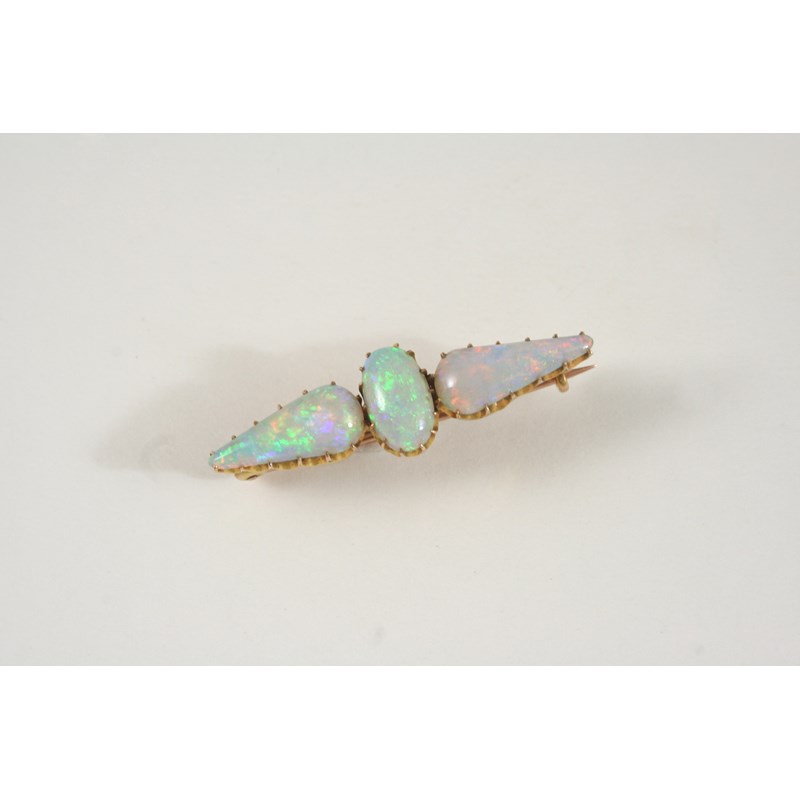 AN OPAL BROOCH set with an oval and two pear-shaped solid white opal cabochons, in gold, 4.5cm. wide.