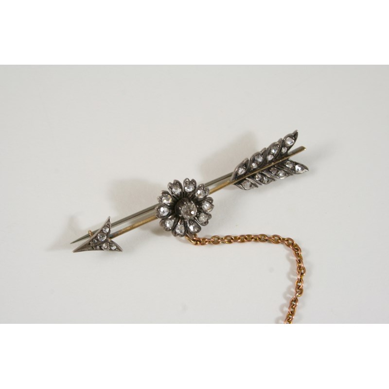 A VICTORIAN DIAMOND ARROW BROOCH set with rose-cut diamonds, in silver and gold, 6cm. long.