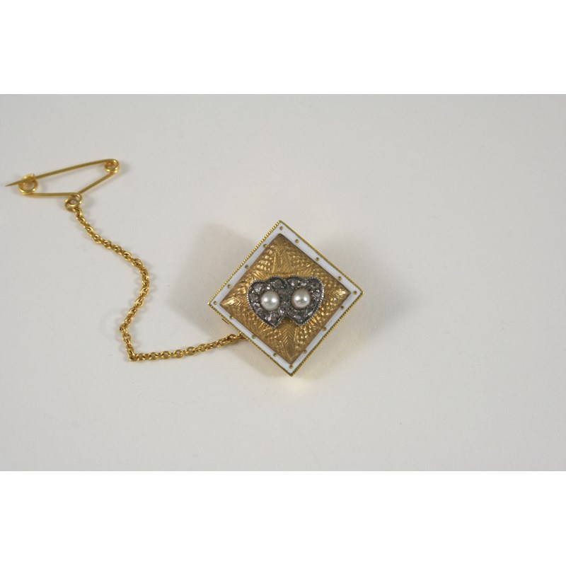 A VICTORIAN DIAMOND, PEARL AND ENAMEL BROOCH