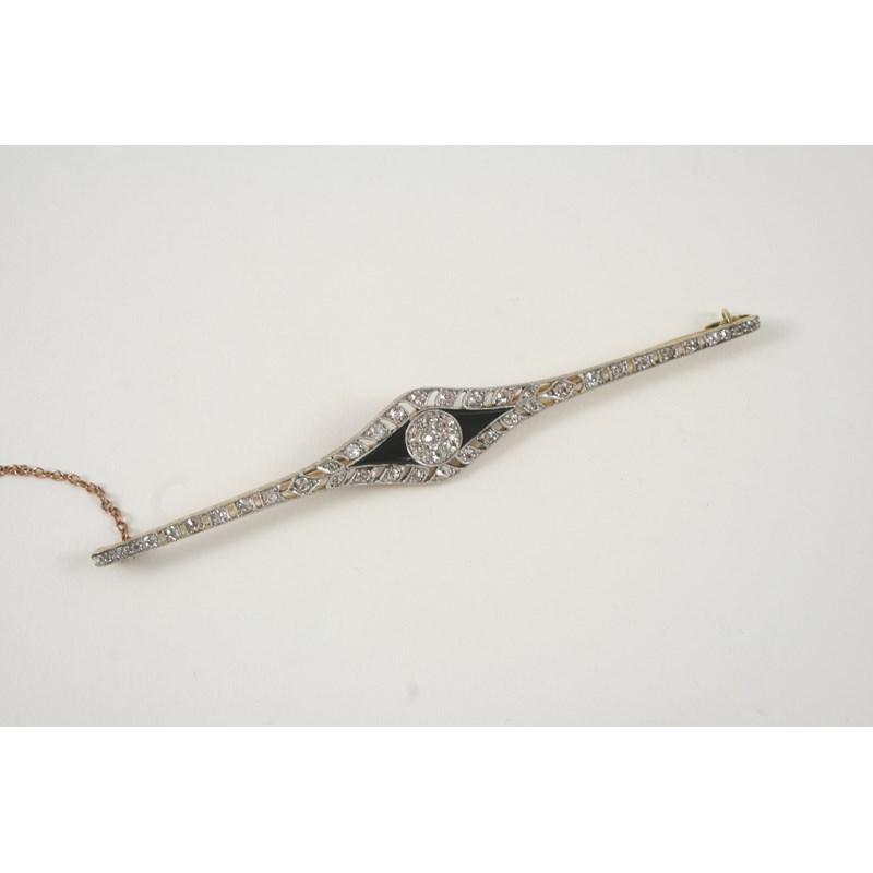 the central cluster of old brilliant-cut diamonds is set with sections of black onyx within an openwork surround of graduated old brilliant-cut diamonds, in gold, 11cm. long.