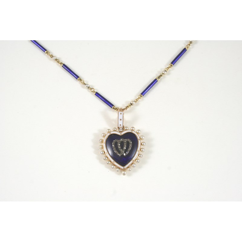 the blue enamel heart is centred with a double heart motif mounted with rose-cut diamonds, within a white enamel and gold border and an outer surround of small pearls, on a gold chain mounted with blue enamel batons and small pearls, with locket compartment to the reverse, the pendant 2.5cm. wide.