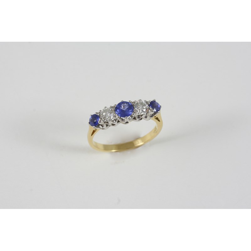 A SAPPHIRE AND DIAMOND FIVE STONE RING the three circular-cut sapphires are set with two circular-cut diamonds, in 18ct. gold. Size P.