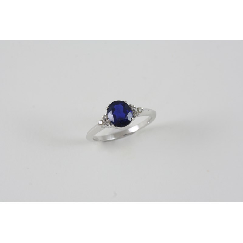 A SAPPHIRE AND DIAMOND RING the oval-shaped sapphire is set with three circular -cut diamonds to each shoulder, in white gold. Size N.