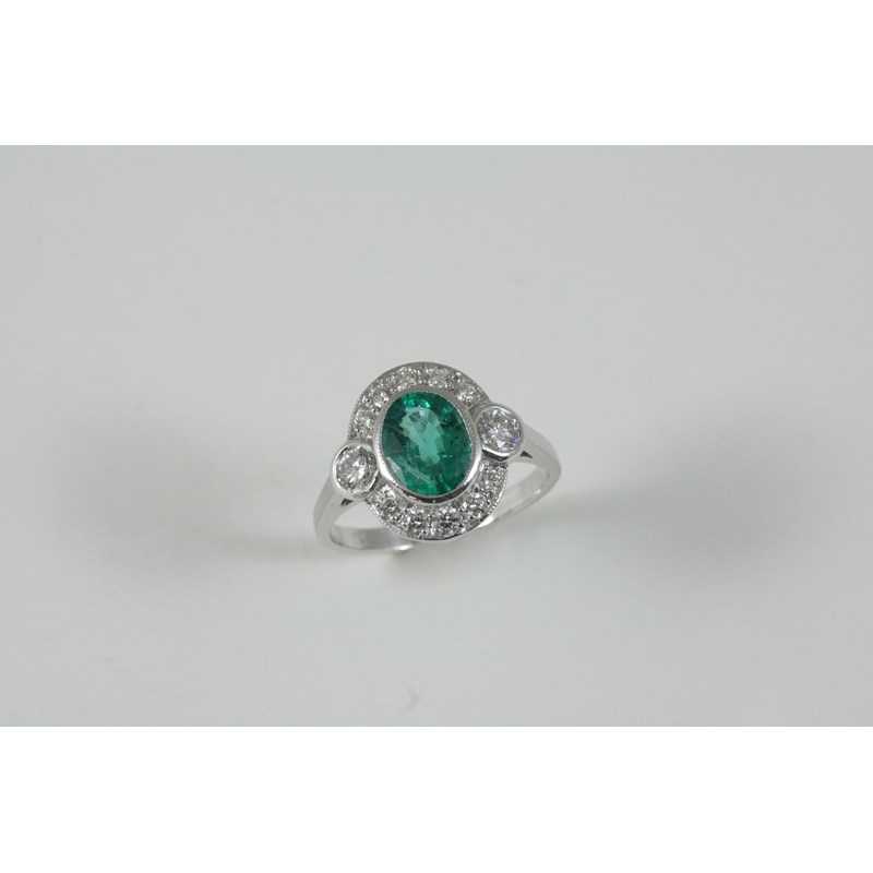 AN EMERALD AND DIAMOND CLUSTER RING the oval-shaped emerald is set within a surround of circular-cut diamonds, in 18ct. white gold. Size N.