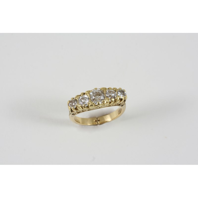 A DIAMOND FIVE STONE RING set with five graduated old brilliant-cut diamonds, in gold. Size K 1/2 - band does expand to Size O.