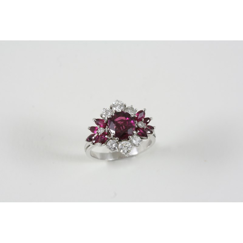 the oval-shaped ruby is set within a surround of graduated brilliant-cut diamonds and marquise-shaped rubies in white gold. Size M.