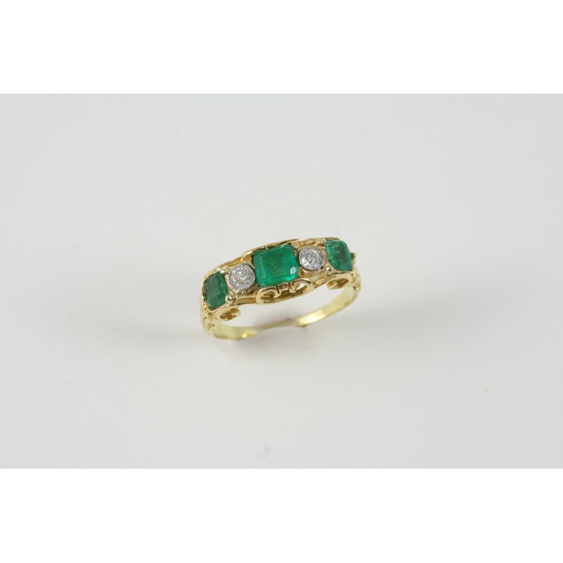 the three rectangular-shaped emeralds are set with two circular-cut diamonds, in a gold scrolling openwork mount. Size N.