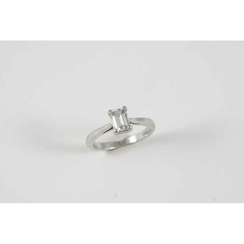 A DIAMOND SOLITAIRE RING the emerald-cut diamond weighs approximately 0.75 carats and is set in platinum. Size L.