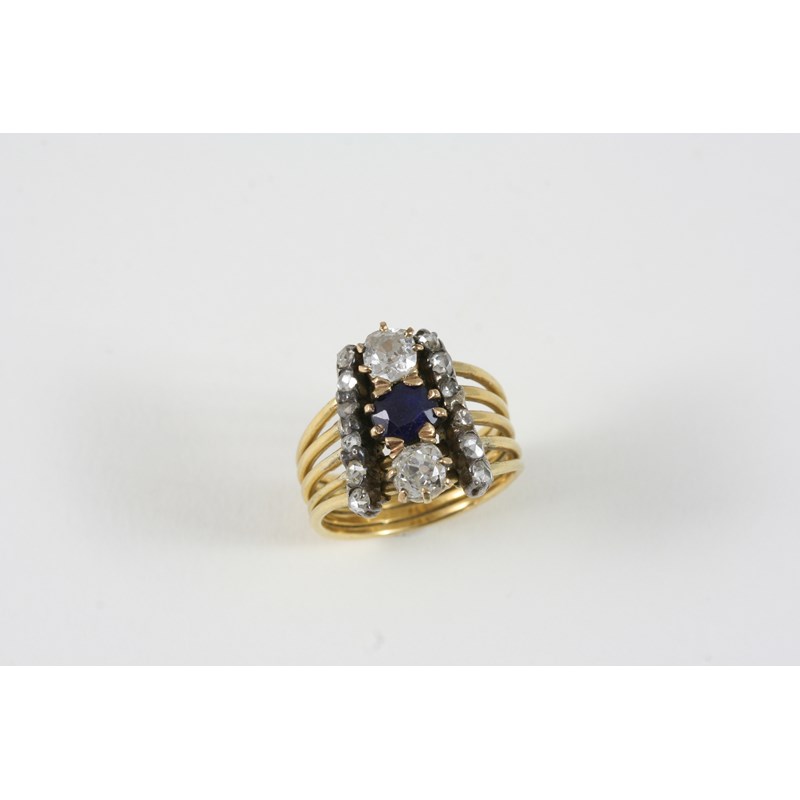 the central sapphire is set with two old brilliant-cut diamonds bordered by rose-cut diamonds, on a five stranded gold shank. Size K.