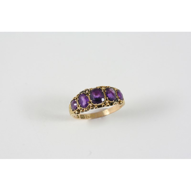 A VICTORIAN AMETHYST FIVE STONE RING the five graduated oval-shaped amethysts are set in 15ct. gold. Size M 1/2.