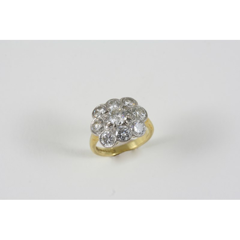 centred with a brilliant-cut diamond within a surround of eight brilliant-cut diamonds and six small diamonds, in 18ct. gold. Size I 1/2.