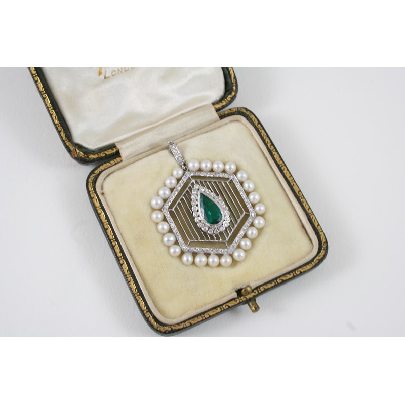 the openwork design is centred with a pear-shaped emerald within a surround of small diamonds and an outer surround of untested pearls, with further diamonds set to the pendant loop, 3.5cm. wide.