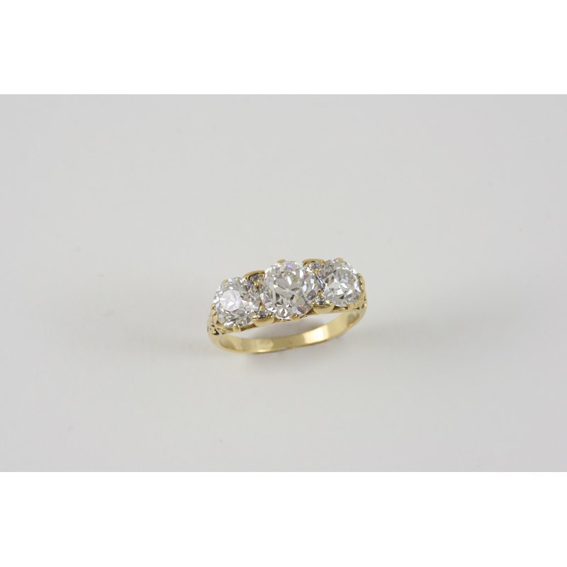 the three old brilliant-cut diamonds are set with four rose-cut diamonds, in gold. Size N.