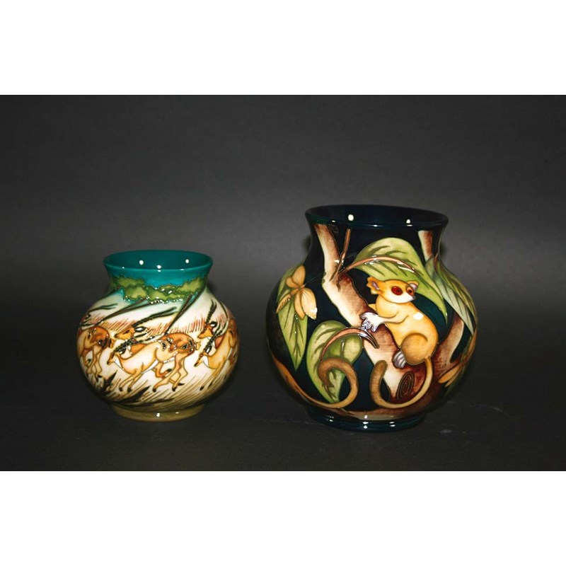a modern vase in the Impala design (designed by Kerri Goodwin), also with another Moorcroft vase designed with Australian Marsupials, possibly Bush Babies, (designed by Vicky Lovatt and dated 2009. Impala Vase marked, Moorcroft, 2007. 4 1/2ins (11.5cms) high. (2)