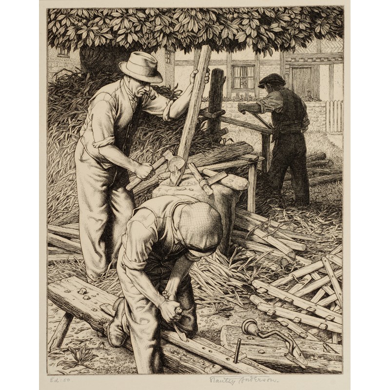 * Herbert and Leonard Soanes, skilled and long-established Oxfordshire hurdle-makers, are seen working with traditional tools. Anderson's remarkable ability to capture detail and texture is evident in the crisp clarity of this print.