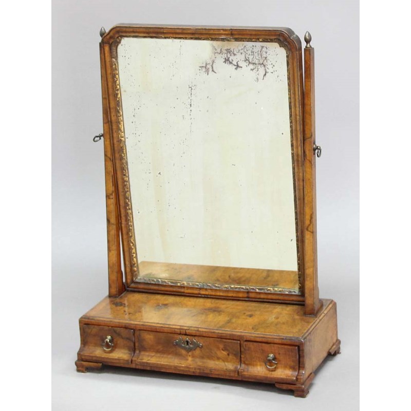 QUEEN ANNE WALNUT TOILET MIRROR, the shaped rectangular glass on rectangular supports, the shaped base with three drawers, height 67cm, width 48cm