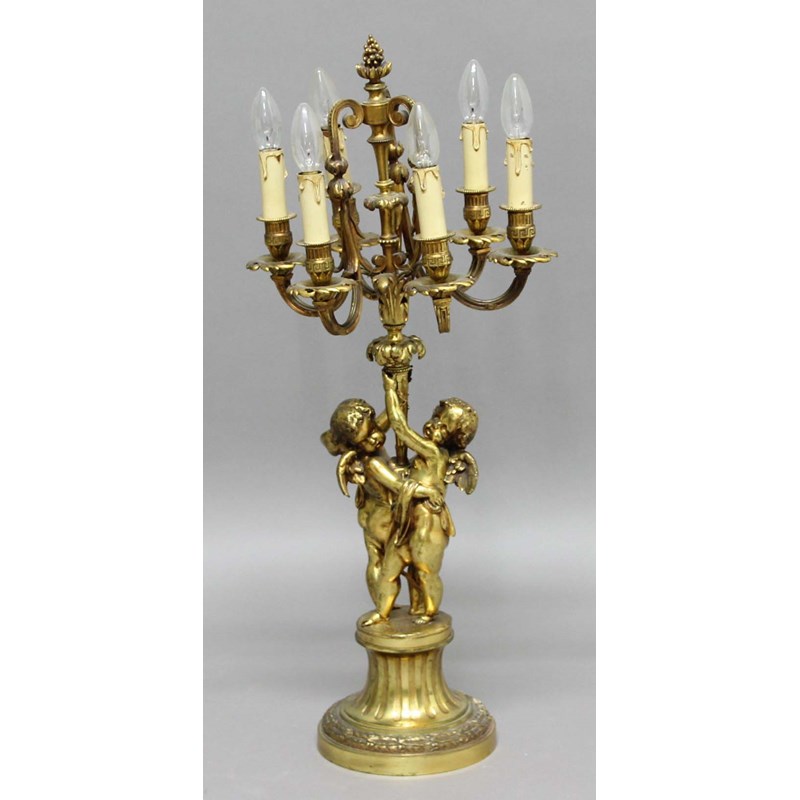 late 19th century, the foliate sconces on scrolling arms from a central fluted column with fruiting lotus flower finial, supported by a pair of cherubs on a socle base with fruiting leaf rim, height 83cm