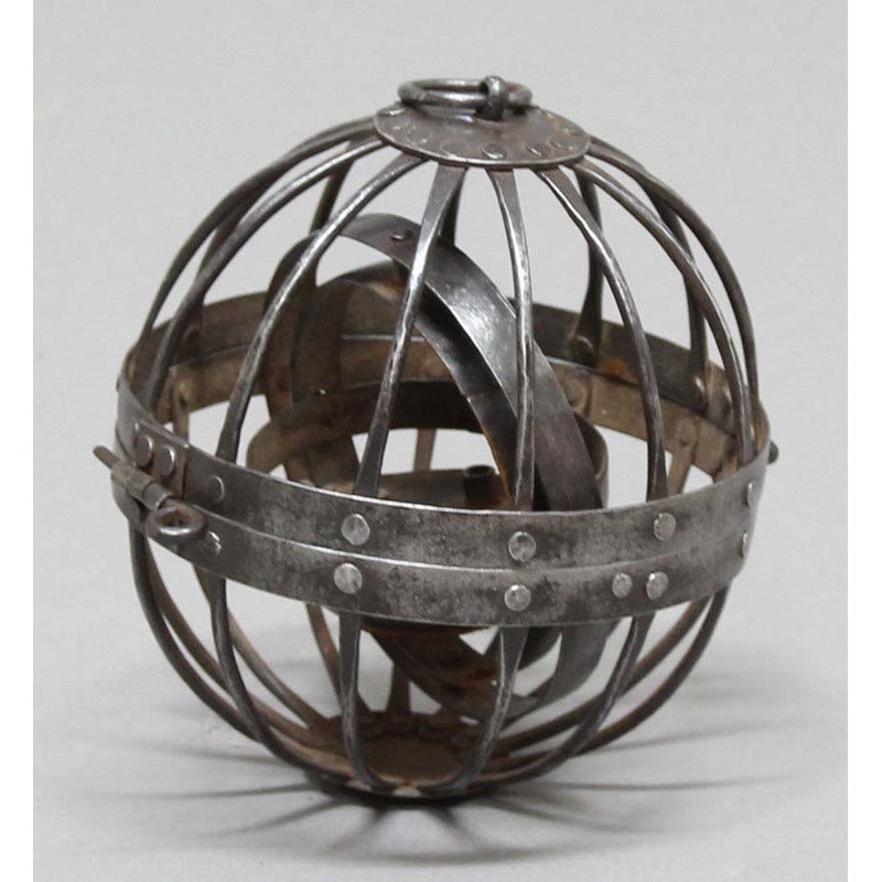 WROUGHT IRON GIMBAL MARITIME OIL LAMP, of spherical form, in two, hinged sections, diameter 13cm