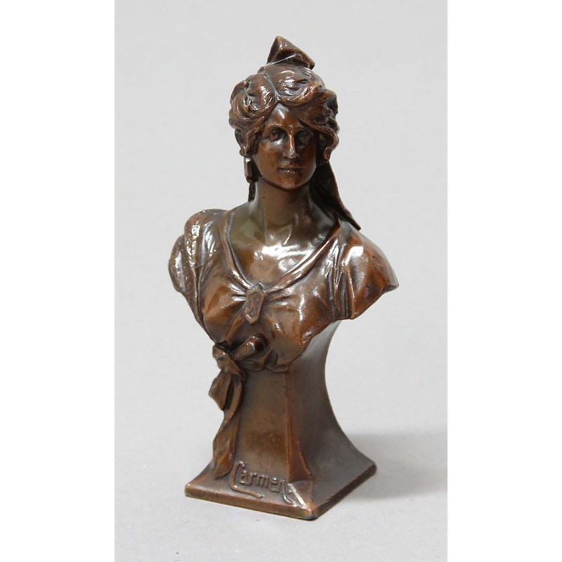 BRONZED BUST, titled 'Carmen' to spreading base, height 15cm
