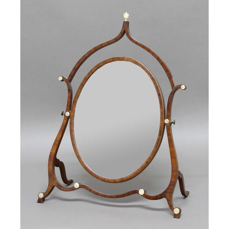 REGENCY STYLE KINGWOOD AND IVORY MOUNTED TOILET MIRROR, the oval plate in a scrolling frame, height 75cm, width 56cm