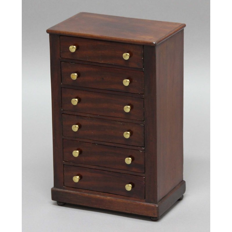 MINIATURE MAHOGANY CHEST OF DRAWERS, the six drawers with brass handles, on bun feet, height 39cm, width 25cm, depth 16cm
