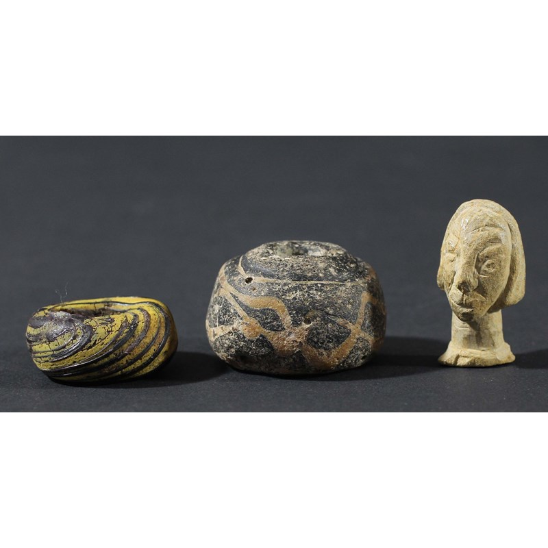 two glass beads, possibly Hebron, with yellow or ochre striations, diameter 3.5cm and smaller; together with a carved stone head, height 3cm (3)