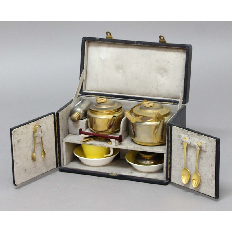 retailed by Maquer, Paris and Nice, in a leather bound case, comprising two Royal Worcester teacups and saucers, kettle and burner, teapot, sugar bowl and milk jug, two tea spoons and a pair of sugar nips, most monogrammed JJG, case height 19cm, width 29cm, depth 15cm
