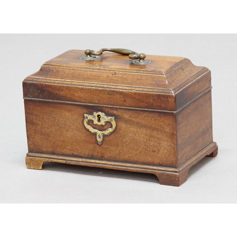 GEORGE III MAHOGANY TEA CADDY, of sarcophagus form, with brass handle and fitted interior, height 16cm, length 23cm, depth 13cm
