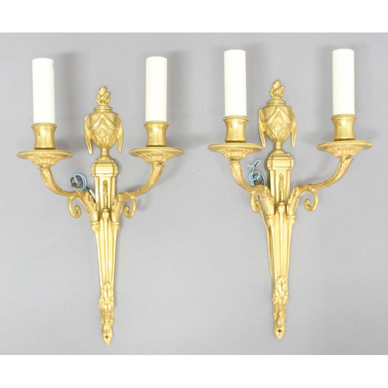 PAIR OF NEO-CLASSICAL GILT BRASS TWO BRANCH WALL LIGHTS, with swagged urn finials and scrolling supports, height 35cm (2)