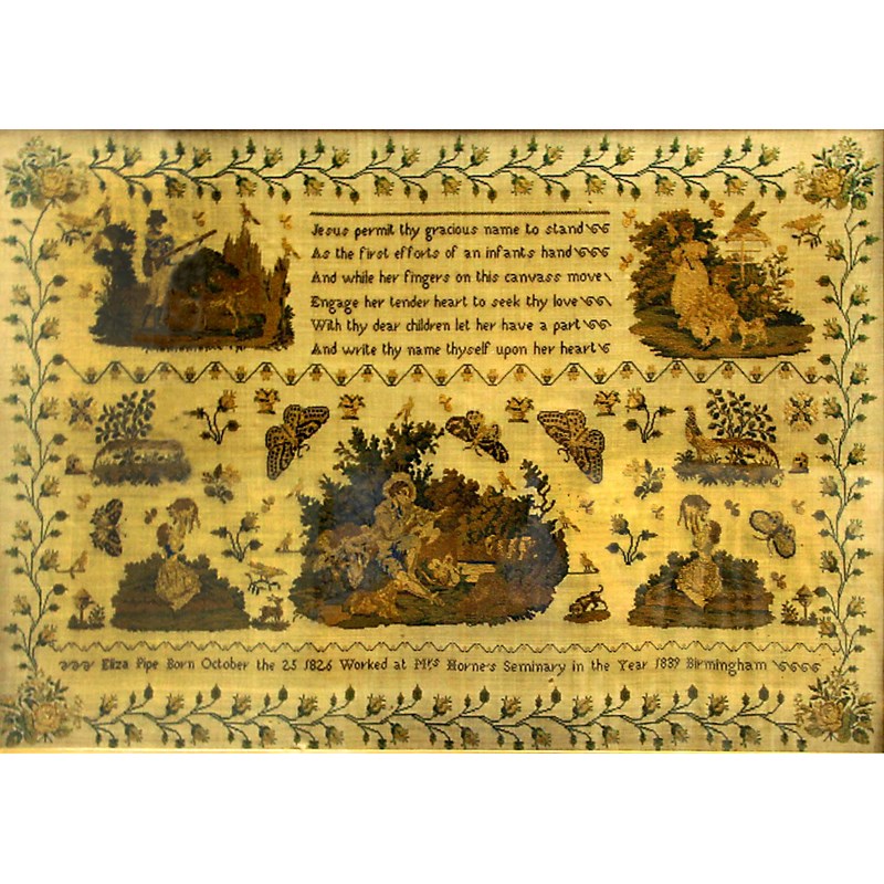 by Eliza Pipe Born October the 25 1826 Worked at Mrs Horne's Seminary in the Year 1839 Birmingham, worked with a rhyme surrounded by various figural scenes flowers and insects inside a meandering floral border, in a rosewood frame, size of sampler 44cm x 63cm