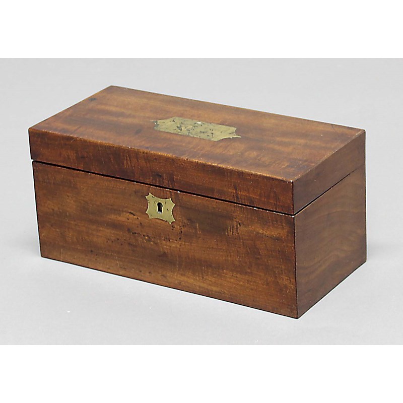 GEORGE III MAHOGANY TEA CADDY, of rectangular form, the interior with twin lidded canisters and glass mixing bowl, height 16cm, length 33cm, depth 15.5cm