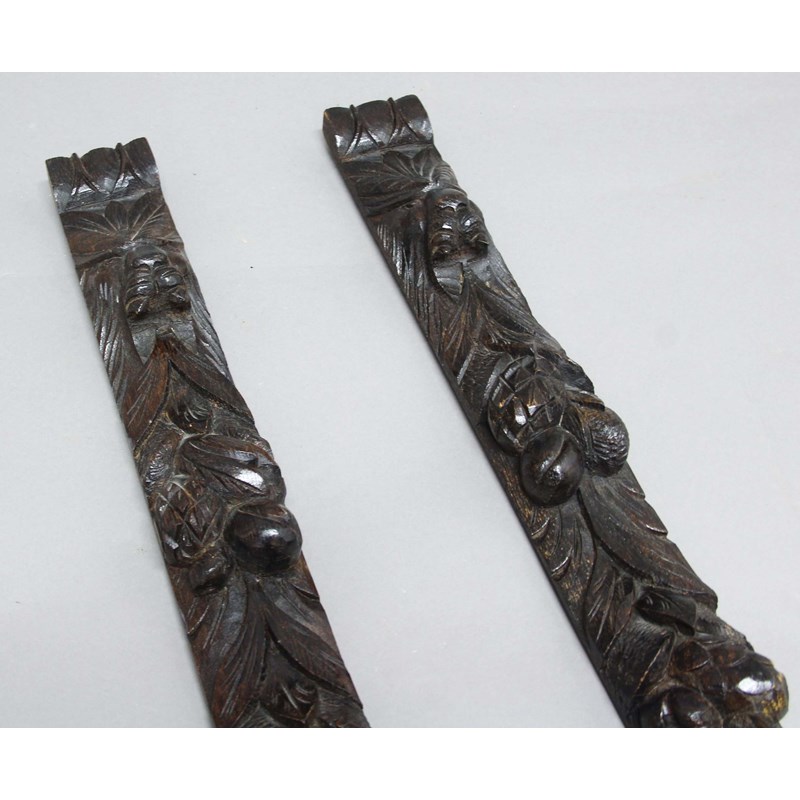 PAIR CARVED OAK PANELS, decorated with lion masks, foliage and fruit, length 117cm (2)